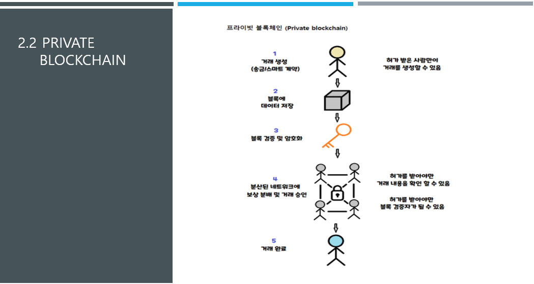 프라이빗 블록체인: 사적인 블록체인, 허가형 블록체인, 기업형 블록체인으로 불린다. 허가된 참여자 외 거래 내역과 여러 행동에 대한 공유가 되지 않고 추적되지 않는다.