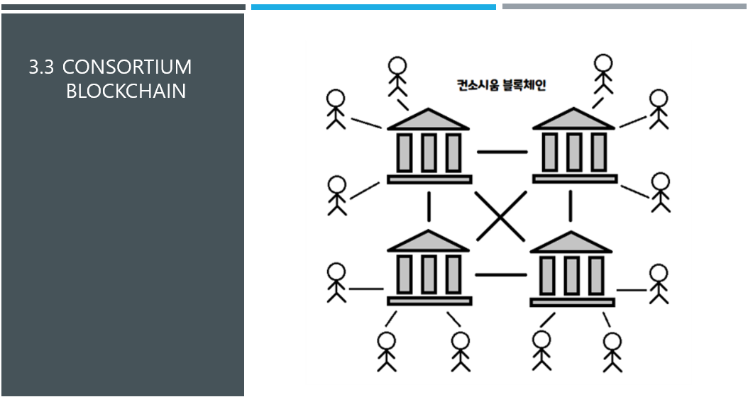 컨소시엄 블록체인: 컨소시엄 블록체인은 퍼블릭 블록체인과 프라이빗 블록체인의 중간 형태로 하이브리드 블록체인으로 분류된다. 중앙 관리자에 의해 승인받은 참여자만이 블록 생성에 참여할 수 있는 프라이빗과 유사한 개념이다. 하지만 프라이빗 블록체인과 달리 목적을 가지고 있는 기관이 하나의 컨소시엄을 구성하여 공정성과 확장성을 확보하였다.제삼자에 대한 거래 수수료를 줄이고 거래 시간을 단축할 수 있다.