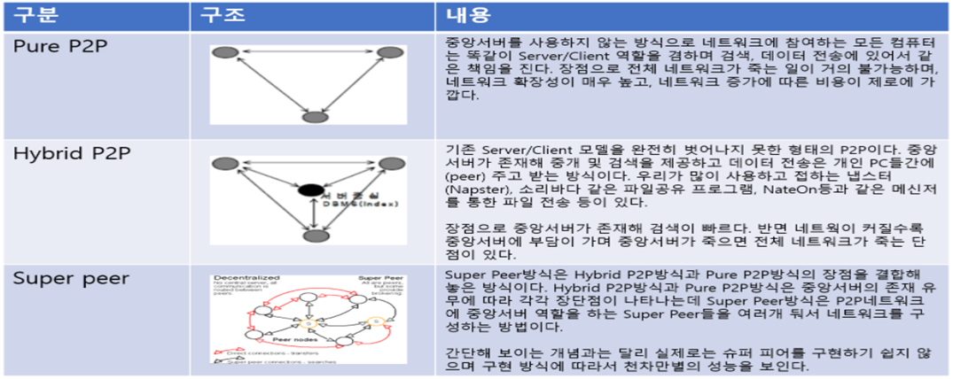 : P2P란 기존의 서버와 클라이언트 개념이나 공급자와 소비자 개념에서 벗어나 개인 컴퓨터끼리 직접 연결하고 검색함으로써 참여자가 공급자인 동시에 수요자가 되는 형태