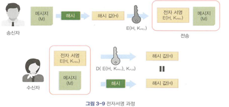 전자 서명이란 송신자의 메시지 전체를 해시 값으로 만든다음 이를 개인키로 서명한 것을 전자 서명이라고 합니다
