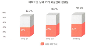 위 그림을 보시면 2017년 12월에 상위 10개 업체의 블록 채굴 점유율이 90.5%까지 독점율이 치솟은걸 볼 수 있습니다. 한편 빨간색 막대로 표시한 상위 3대 업체의 점유율을 보면 2017년 마지막달에는 무려 52%대로 올라와 절반을 넘어선걸 알 수 있습니다. 전체 블록의 과반을 단 세개 업체가 독점하고 있는 것입니다. 상위 3대 업체는 모두 중국 업체이며 10대 채굴업체에 속한 나머지 기업들도 대부분 중국 업체가 직접 운영하거나 간접적으로 참여하고 있습니다. 사실상 중국이 전 세계 비트코인 채굴을 완전히 장학하고 있다고 볼 수 있습니다.