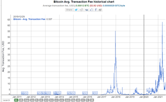 또한 비트코인 트랜잭션의 평균 수수료는 2018년에는 52.18달러였고, 올해 최고는 62.78달러였다. 이는 비트코인으로 물건 값을 지불하게 되면 모든 물가가 이만큼씩 오른 셈이라는 것을 의미합니다. 즉 4달러짜리 커피를 사려해도 수수료가 40달러라고 가정하면 44달러를 지불해야 하니 수수료가 10배 더 비싼 셈입니다.