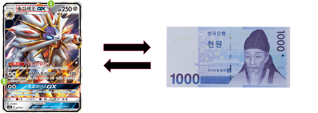 예시로 간단히 살펴보자면 종잇조각인 포켓몬 카드는 어린이들 사이에서 천원에 거래되고 있습니다. 누군가 그 가치가 천원이라고 주장할 수도 있지만, 포켓몬 카드로는 상점에서 물건을 살 수 없습니다. 상점 주인은 어린이가 아니므로 포켓몬 카드에 가치를 두지 않을 것이기 때문입니다. 따라서 포켓몬 카드에는 교환의 범용성이 없습니다. 물론 어린이들끼리나 마니아들 사이에서는 포켓몬 카드를 사기 위해서 천원의 법정통화를 서로 주고받으며 거래하겠지만 이는 그들 간의 거래일 뿐입니다.