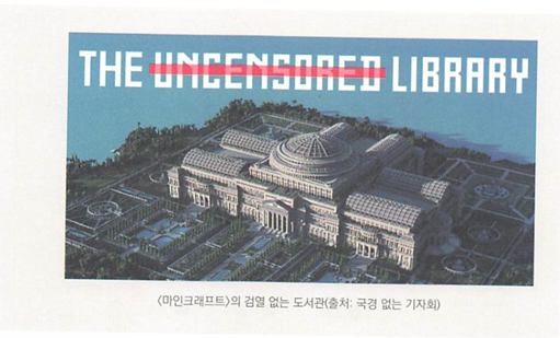 마인크래프트의 검열없는 도서관이다. 게임 속에 가상의 도서관을 생성한 다음, 전 세계에서 검열당한 기사 등을 게재하고 있다. 진실된 콘텐츠나 소식을 전하는 데 큰의미가 있지만, 반대로 이러한 진실을 지울 수 없는 것이 오히려 문제점으로 대두될 것으로 생각된다.