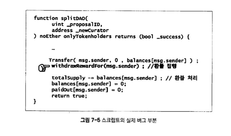하지만 위의 스마트컨트랙트에는 엄청난 버그가 있었는데, 투자 모집기간에 고객이 환불을 요청해 오면 바로 환불해주도록 코딩돼 있다. 문제는 환불 요청이 들어오면 환불 완료 플래그를 설정한 후 대금을 지불하지 않고, 먼저 대금을 환불하는 함수부터 호출하고 나서 환불 완료 플래그를 설정하도록 만들어진데 있다. 위의 함수 부분을 보면 withdrawRewardFor함수를withdrawRewardFor 호출한 후 환불 완료를 그다음에 하도록 처리되어 있다. 이 때문에 환불 처리 완료 전 동일한 요청이 들어오면 환불을 집행하는 함수가 반복적으로 호출될 수 있는 문제점을 안고 있었다.. THE DAO는 모든 소스코드를 모두에게 공개해놓은 터라 이 취약점은 해커들에게 포착되고, 2016년 6월 17일 해커는 투자금 환불을 반복적으로 요청하는 공격을 감행한다. 그 결과 360만 이더리움 당시 금액으로 600억 원에 달하는 거액이 도난당한다.. 이 사건을 계기로 비탈린 부테린 주축으로 하드 포크를 진행하고자 하였고, 한쪽은 한번 기록한 것은 변경되지 않아야 한다는 블록체인의 기본정신을 해치는 것이라고 반박하였다. 하지만 비탈릭 부테린을 주축으로 90 퍼 이상의 지지를 얻어 하드 포크를 감행하였는데, 이 결과로 기존의 이더리움인 이더리움 클래식과 현재 이더리움으로 분리되었다. 이 사건을 계기로 블록체인에 사람들은 회의를 일으켰고, 실제로 많은 이들의 지지를 얻으면 자신들의 이익을 위해 조작하고 변경할 수 있는 시스템인 사건의 단적인 예를 보여준다. 탈중앙화의 동의어는 투명이나 정직 또는 자유가 아니고, 탈중앙화는 권력을 배제시킨다고 하지만, 권력은 소프트웨어로 통제되는 것이 아니라 그를 사용하는 사람에 의해 통제되는 것이다.