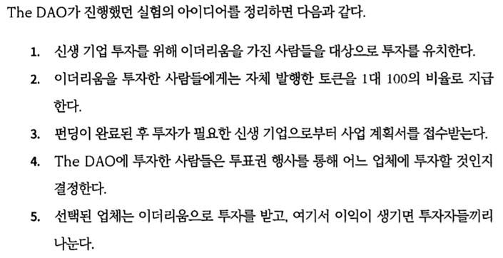 DAO는 DECENTRALIZED AUTONOMOUS ORGANIZATION의 탈중앙화 자율 기구로 이 단어는 블록체인을 통한 독립성, 투명성을 상징하는 단어처럼 암호화폐 커뮤니티를 중심으로 빠르게 퍼져 나갔다. 비탈릭 부테린을 중심으로 THE DAO조직을 결성후 흥미로운 실험을 구상한다. 평범한 펀딩과 투자활동으로 보이는 이 아이디어에는 기존의 방법과는 다른 탈중앙화된 관리가 있었다. 그들은 이 실험에서 이사회를 비롯한 어떠한 조직도 구성하지 않기로 정하고, 오로지 이더리움 블록에 저장된 스마트 컨트랙트만을 사용해 전체 프로세스를 진행하였다.