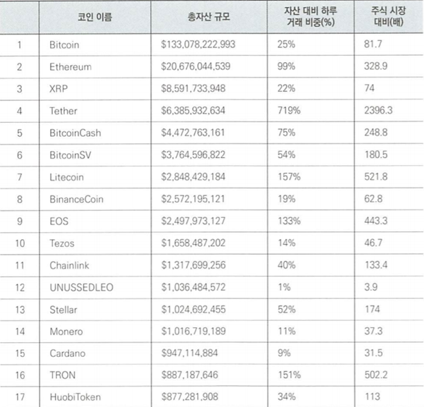 거래소가 365일 24시간 운영되며 규정의 사각지대에 있는 것은 거래자들이 시세조종에 무방비 상태가 되는 또 다른 원인입니다. 다음 표를 살펴보면 자산 규모 상위 20위권에 있는 코인들의 평균 자산 대비 하루 거래 비중은 무려 92%로 주식시장의 307배에 이릅니다. 이는 전체 자산의 92%를 하루 만에 사고팔고를 반복한다는 의미로, 심각한 투기 현상을 뜻합니다. 거래소들이 부과하는 거래 수수료는 대략 거래 금액의 0.1%~0.2% 수준으로 Home Trading System의 최소 10배 이상입니다.
