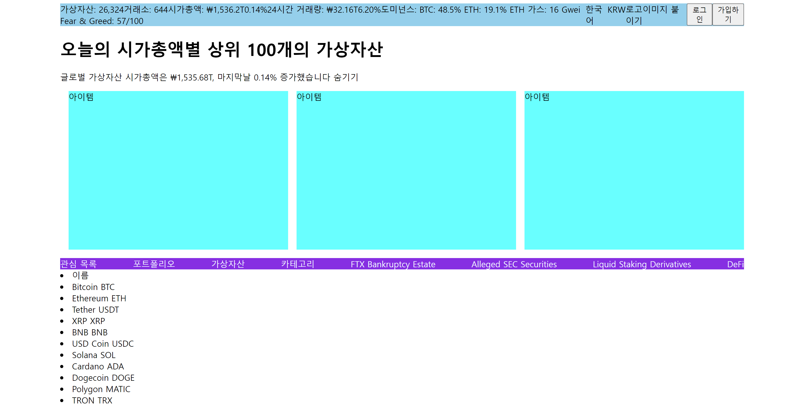 가상자산추가 부분은 for문으로 div 들을 추가였는데 실제 코인마켓캡에는 여러 요소들을 추가하여야 하기 때문에 th, td를 추가하여 사용하여 표 형식으로 데이터를 추가할 예정이다. 또한 가운데 아이템에는 애니메이션 이동을 추가하여 세 가지 화면을 애니메이션 화 하는 작업을 진행할 예정이다.