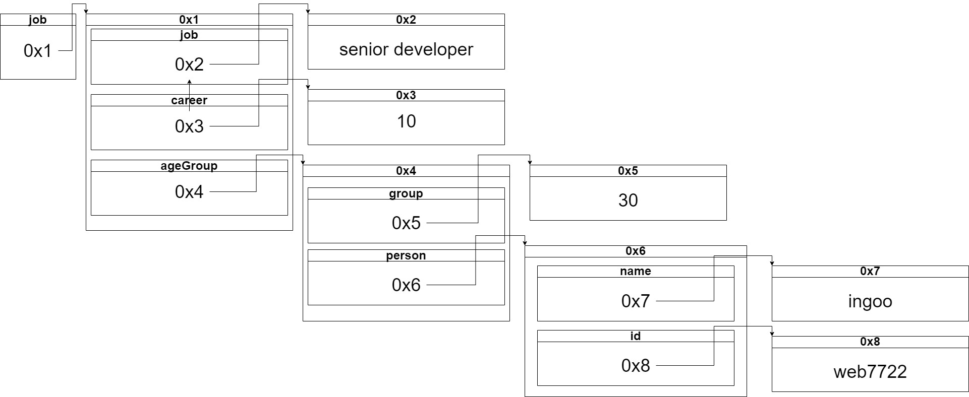 첫 번째로 job 객체가 생성되면 job 객체는 영역을 할당하고 영역은 키값으로 job, career, ageGroup 으로 나뉜다. 각각의 키값들은 각각의 키에 대한 value 값을 저장하기 위해 값을 저장한 주소를 가리키는데 원시타입 job의 데이터는 senior developer로 원시타입 String, career는 10으로 원시타입 Number 데이터를 가지고 있기 때문에 할당된 주소에 값들을 저장한다.