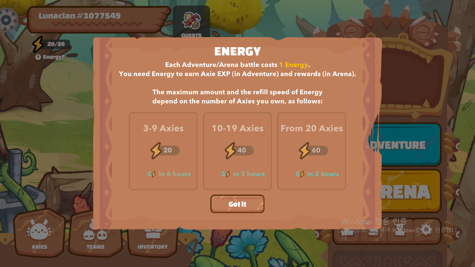 참고로 스테이지나 아레나를 할때마다 에너지가 1씩 줄어드는데요 이는 시간에 지남에 따라 채워집니다!