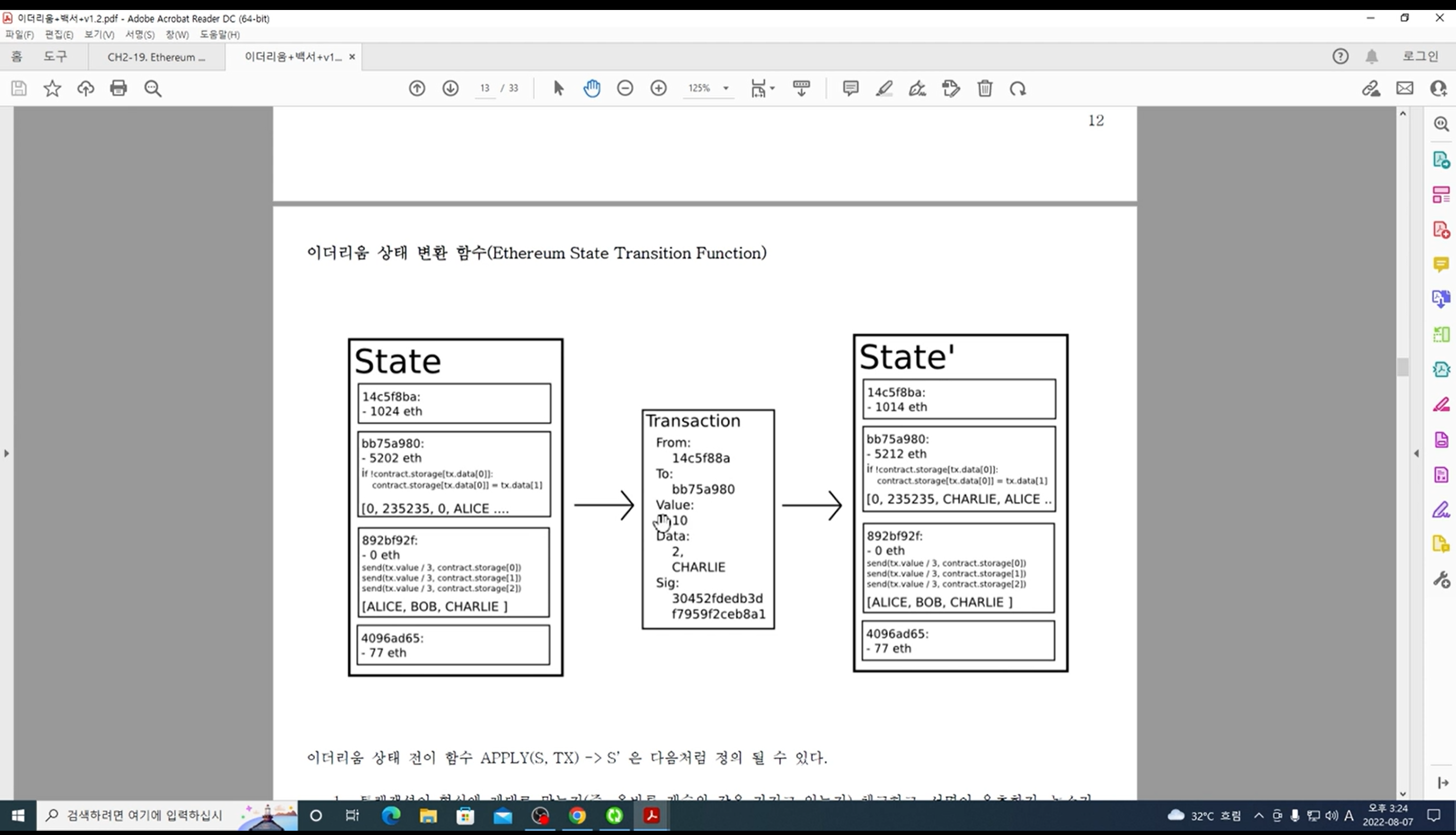 두 번째로 맘에 들었던 것은 이더리움 파트이다. 블록체 인하면 비트코인이긴 하지만, 블록체인 개발에서 가장 큰 비중을 차지하는 것이 바로 이더리움이다. 역시 이더리움 백서를 보고 시작하는 것 역시 마음에 들었다. 나름 DApp개발을 위해 솔리 디티도 공부하고 이더리움 테스트 넷에도 배포해본 나였지만, 아이러니하게도 이더리움 백서를 본 것은 대학 3학년 시절 초반 부분을 영어로 읽다가 못 읽겠다 하고 뛰쳐나간 나였다. 대학시절 못 본 백서를 한국어로 보다니! 이러 부분은 다른 교육기관에는 없다는 것이다. 이더리움 부분은 대부분 이더스 캔을 뜯어보면서 그것들이 무엇을 의미하는지 설명을 해주고 동작하는 방식 위주로 설명해주셨다. CHAP1 부분은 정말 입문자들에겐 괜찮은 강의였다. 이더리움 부분에서 NFT, DEFI, DAO 등이 나오는데 사실 입문자들은 CHAP1의 이더 파트부터 듣는 것을 추천한다. 비트코인 파트는 어떤 강의를 듣건 알고리즘 적인 부분이 많아서 이더 파트를 먼저 듣는 것을 추천한다.