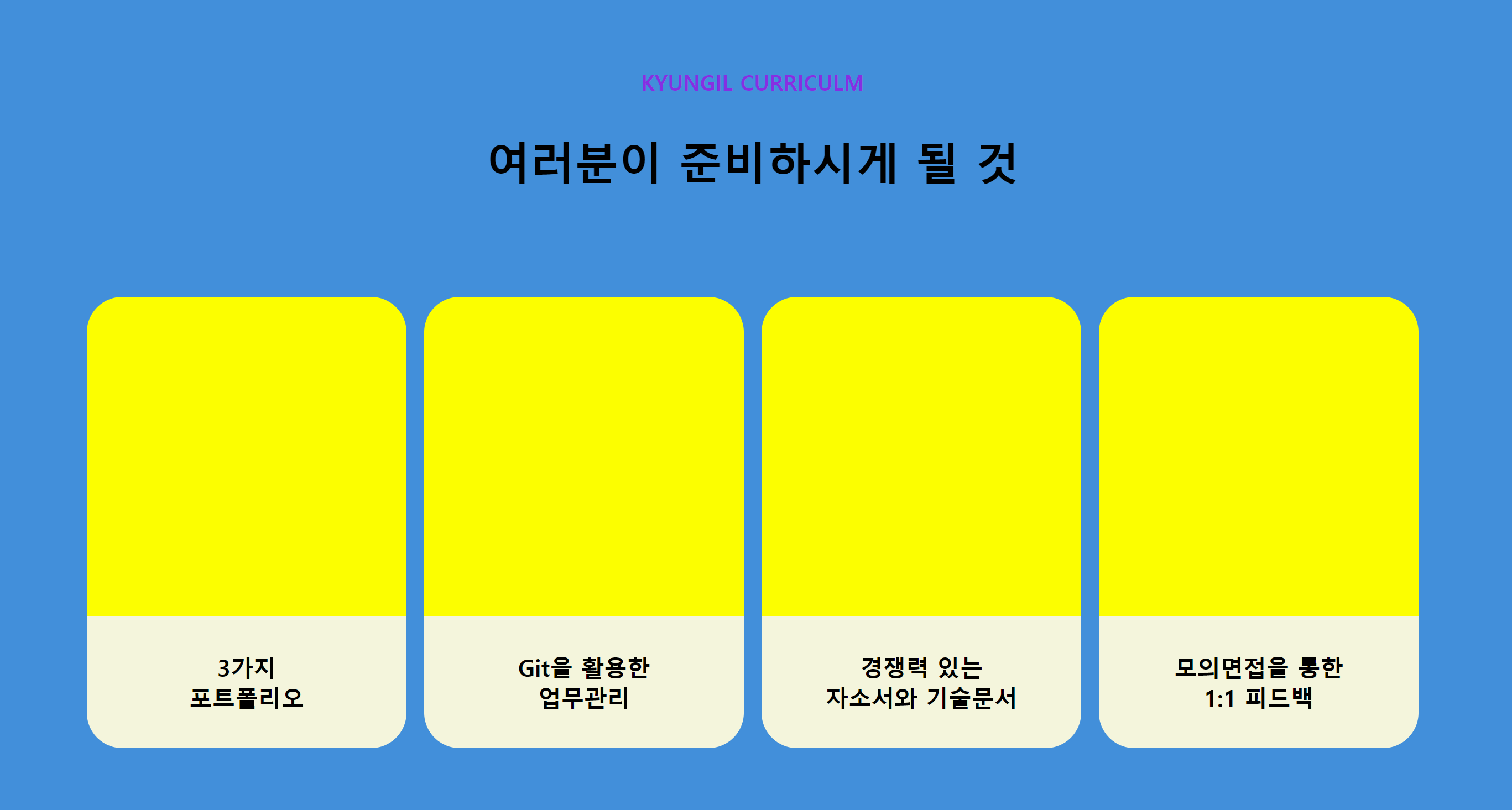 커리큘럼 홈페이지를 클론 하기 앞서 어떤 식으로 클래스를 감쌓주고 텍스트박스와 item요소들을 지정할지 고민하였다. 반응형 웹으로 개발하기 위해, 화면을 줄이면서 어떤 식으로 반응하는지 살펴보았다. 화면이 특정 px 보다 작아졌을 시 네 가지 아이템이 보이다가 두 가지 아이템만 보이도로 반응하였다. 이를 구현하기 위하여 전체를 묶어주는 컨테이너박스 아래에 title-box와 box-wrapper로 감쌓주었고, box-wrapper 아래에 div > class box > class square, p 태그를 이용하여 두 개를 div로 묶음처리하여 웹이 작아진 상황에 4개에서 2개가 보이는 반응형 웹을 개발하였다.