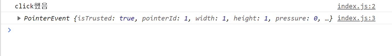 btn 아이디인 버튼 확인? 을 클릭하게 되면 아래와 같이 click 했음과 PointerEvent 객체가 출력된