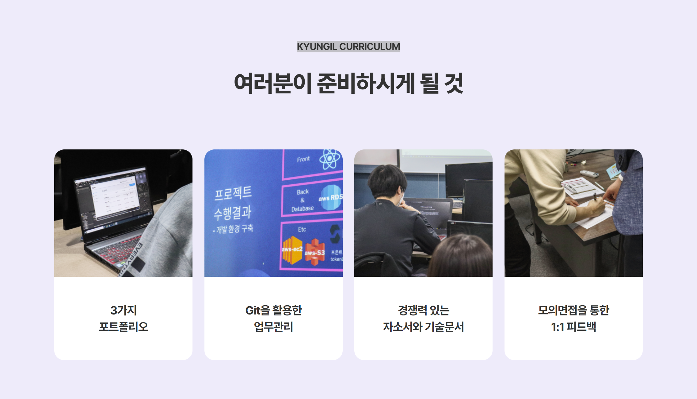 커리큘럼 홈페이지를 클론 하기 앞서 어떤 식으로 클래스를 감쌓주고 텍스트박스와 item요소들을 지정할지 고민하였다. 반응형 웹으로 개발하기 위해, 화면을 줄이면서 어떤 식으로 반응하는지 살펴보았다. 화면이 특정 px 보다 작아졌을 시 네 가지 아이템이 보이다가 두 가지 아이템만 보이도로 반응하였다. 이를 구현하기 위하여 전체를 묶어주는 컨테이너박스 아래에 title-box와 box-wrapper로 감쌓주었고, box-wrapper 아래에 div > class box > class square, p 태그를 이용하여 두 개를 div로 묶음처리하여 웹이 작아진 상황에 4개에서 2개가 보이는 반응형 웹을 개발하였다.