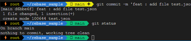 이 상태에서 git commit -m 'feat : add file test.json' 을 통해 자신이 기록할 커밋메시지로 커밋을 하게 되면, 자신이 올린 파일이 커밋 메시지와 함께 깃 repository에 올라가게 된다.